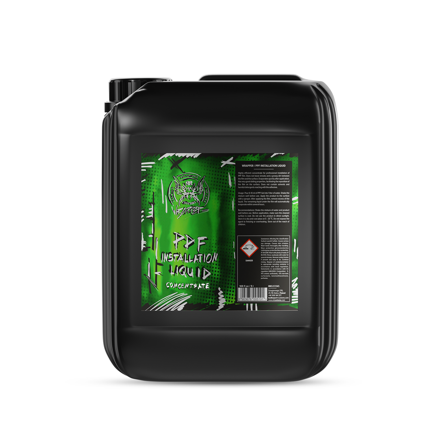Liquide d'installation PPF 5L - Concentré à diluer - Facilite grandement la pose du film - S'évapore sans laisser de traces - Ne contient aucune substance susceptible d'altérer l'adhérence de la colle - Idéal pour les grandes surfaces (capot, portes, toit, ailes) Conseils d'application : Appliquez le gel sur une surface propre et préparée, ainsi que sur la face extérieure du film pour faciliter le passage de la raclette. Recommandations : Durée de conservation : deux ans à compter de la date de fabrication. À conserver à l'abri de la lumière, à température ambiante (5-25 °C). Diluer avec de l'eau distillée. Il est recommandé de conserver le produit dans un emballage noir. Une exposition prolongée au soleil peut rendre le produit trouble, sans altérer son efficacité. Ne pas exposer au gel.